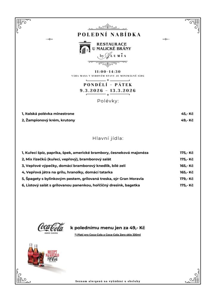 Polední nabídka na týden 9. 3. – 13. 3. 2026 v Restauraci U Malické brány by Lumía přináší chutné obědové menu ve všední dny od 11:00 do 14:30. V nabídce najdete lehké polévky i sytá hlavní jídla — od kuřecího špízu a mixu řízečků až po vepřové výpečky, játra na grilu, špagety s treskou nebo salát s grilovanou panenkou. Ideální volba pro rychlý a poctivý oběd v příjemném prostředí.